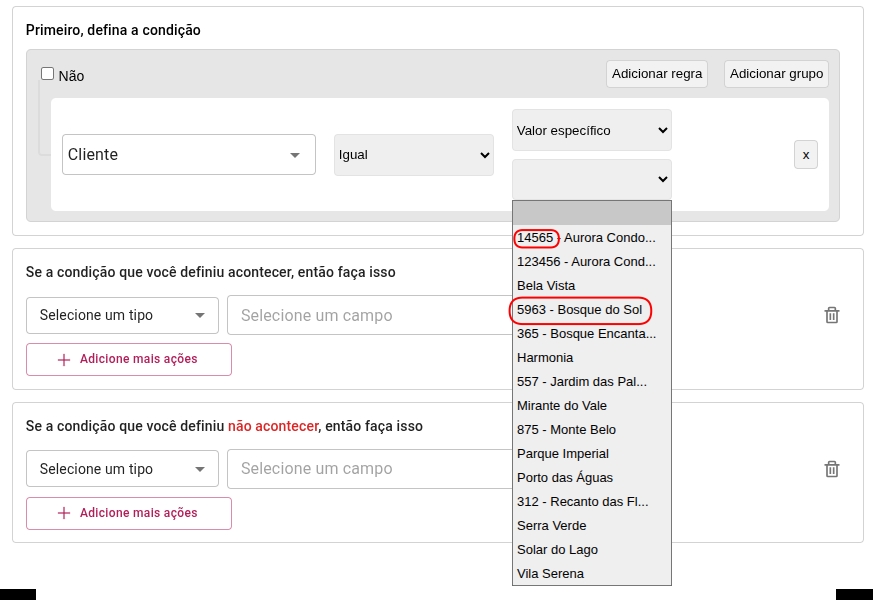 Agora, ao aplicar condições de regras e automações, o usuário visualiza também o código do cliente. Assim, é mais simples identificar corretamente o cliente, principalmente quando há nomes semelhantes ou repetidos.